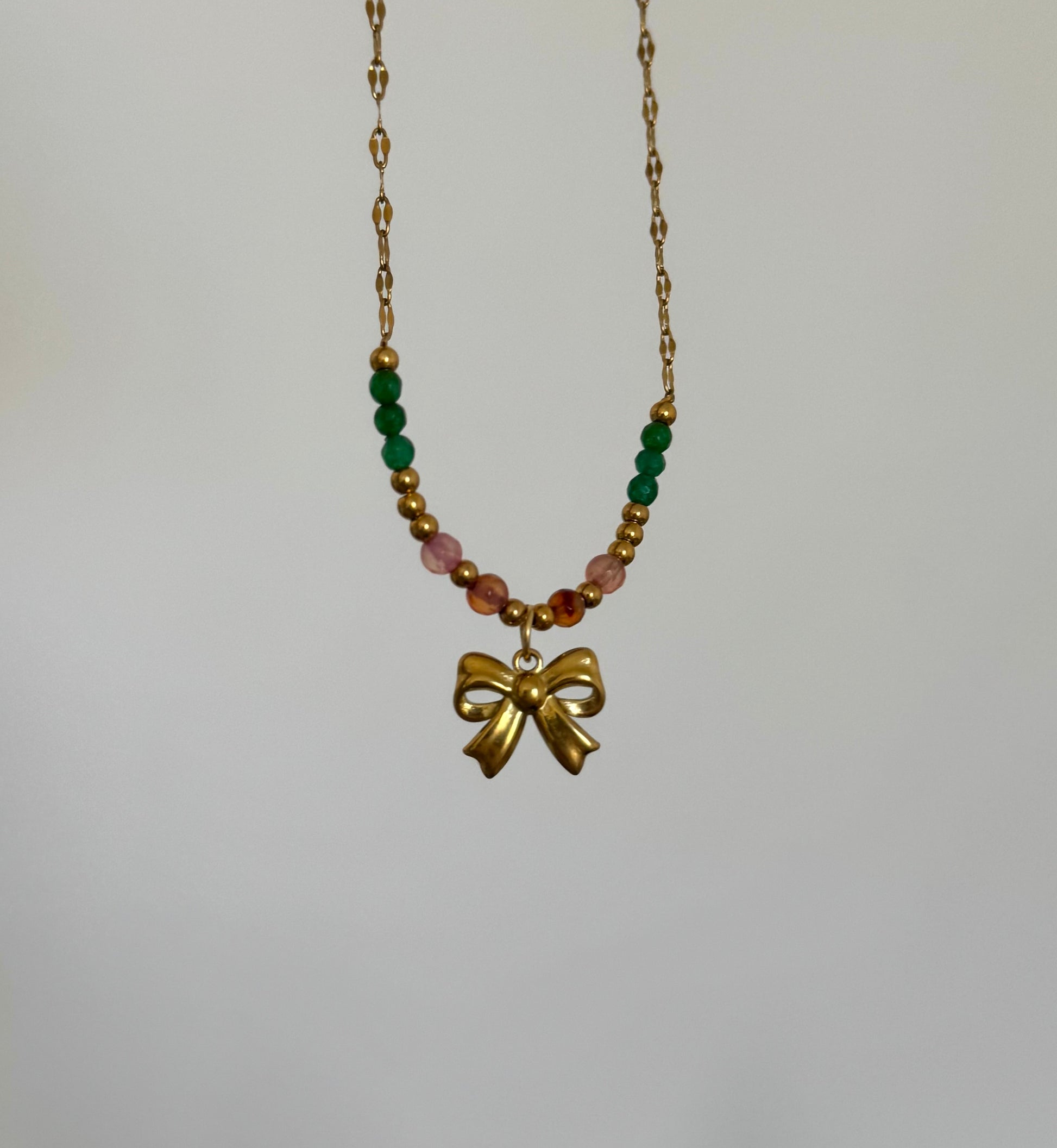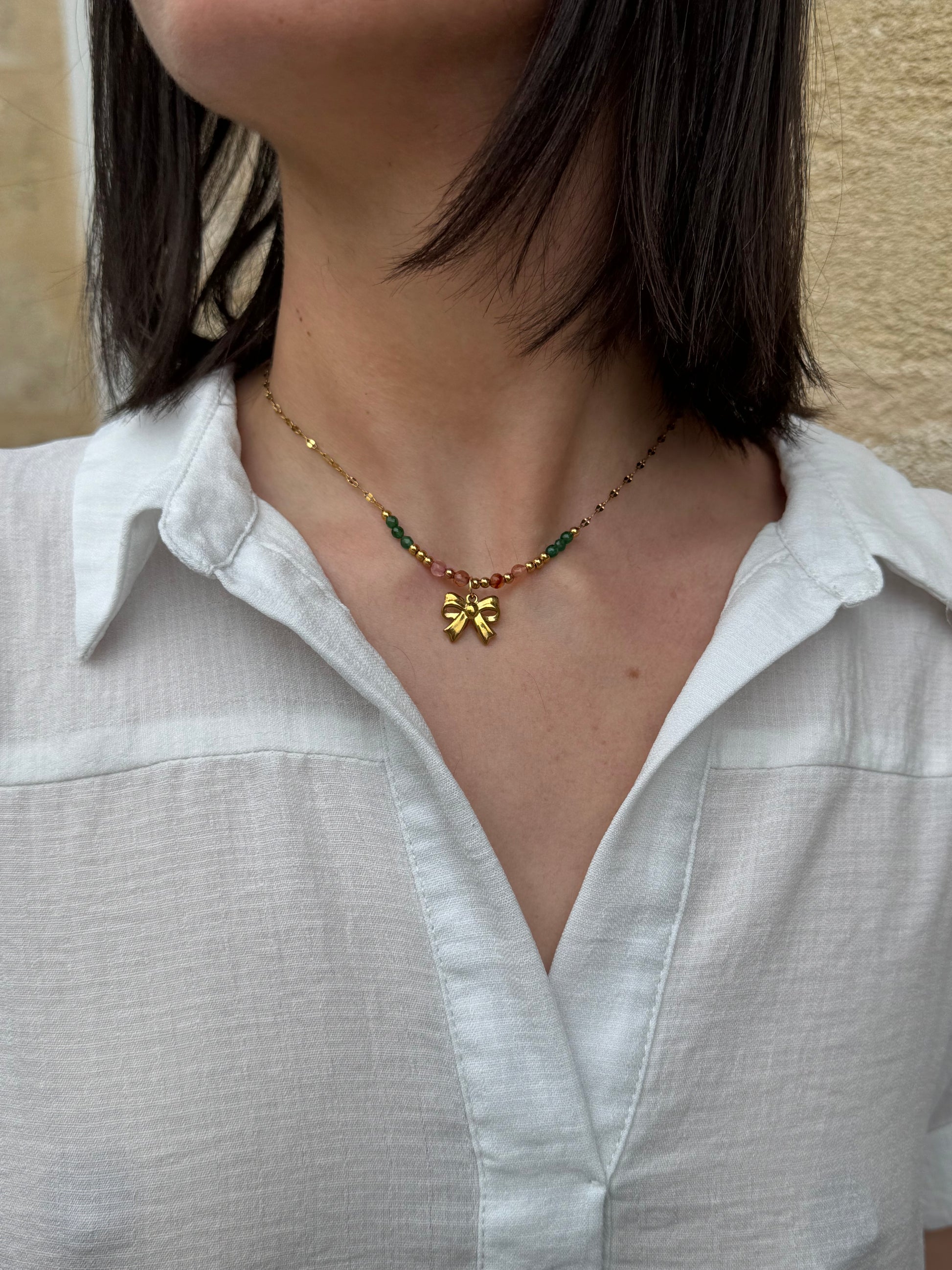 Le collier MIMI mèle des perles multicolores et une chaîne dorée, au coeur de tout ça une breloque noeud pour harmoniser le tout, un équilibre parfait pour un look coloré